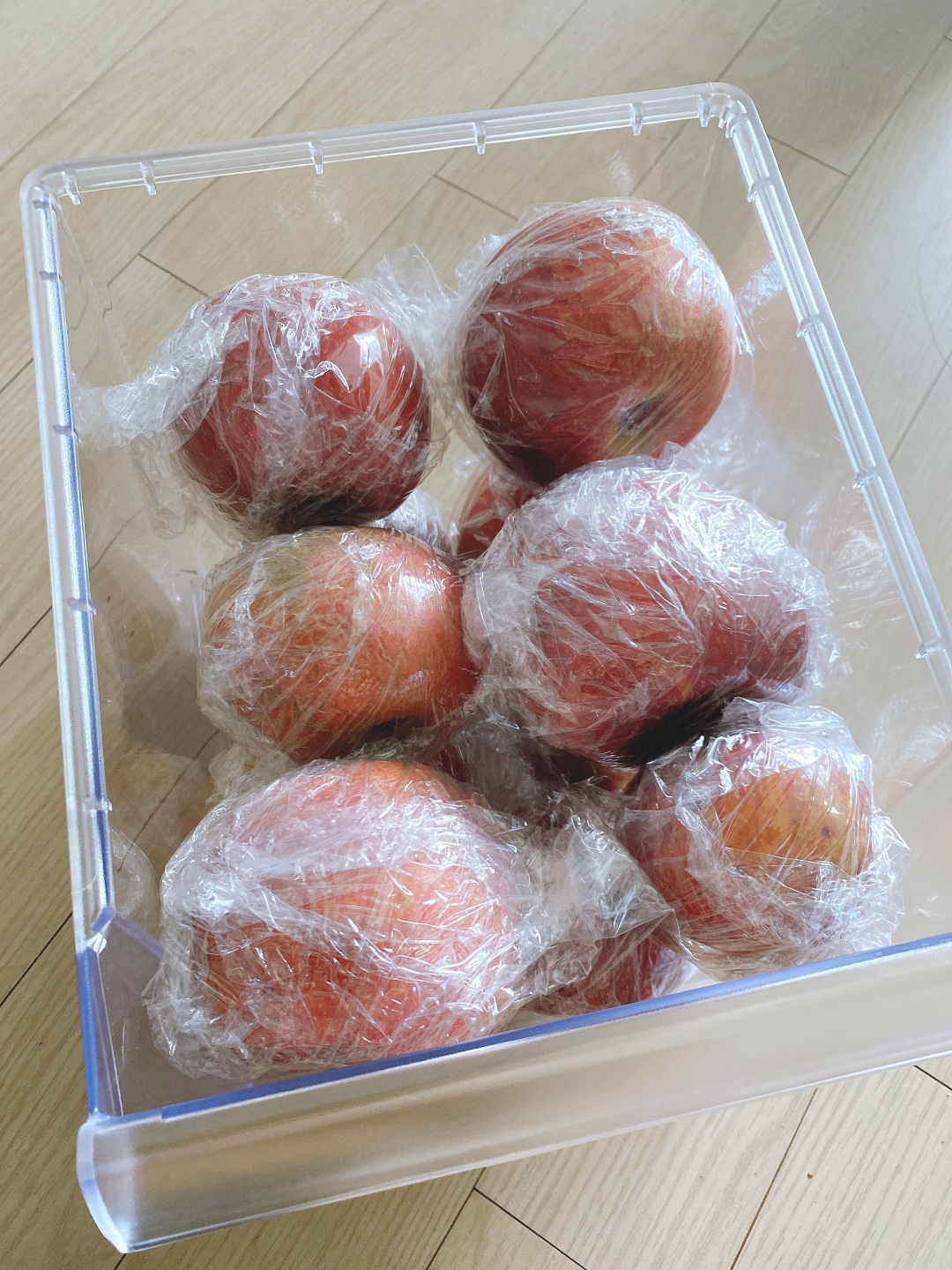 사과를 한 개 한개 랩을 싸서 냉장보관하는 것이다. 이렇게 사과를 보관하면 길게는 1달 이상 보관이 가능하며, 사과의 아삭아삭한 식감을 그대로 유지하며 오래 맛있게 먹을 수 있다.