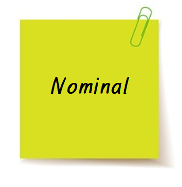 Nominal : 명목상의, 이름뿐인, (돈의 액수가)아주 작은, 아주 얼마 안되는, 거의 이름뿐인, (언어학)명사의, (무게/값) 공시적, 액면적, 명목적, (공학)규격내에, 허용오차내에, 예상범위내에