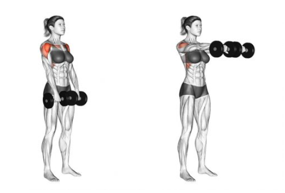전면삼각근, 어깨 앞쪽머리를 강화시키기에 좋은 운동이다. 서 있는 상태 에서 진행하며 덤벨을 잡은 손의 손바닥이 지면을 향하도록 해야한다. 위의 사이드 레터럴 레이즈와 마찬가지로, 팔이 지면과 평행이 된 상태에서는 5초 유지를 시켜주고, 팔을 내릴때는 반동이 아닌 근육긴장을 유지한 체 천천히 내려주도록 한다.