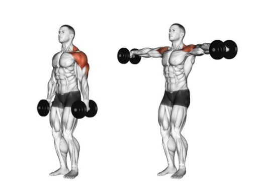 넓은 어깨를 만들기 위해서는 최고의 운동이다. 측면 삼각근 강화에 좋은 자세다. 선 상태에서 덤벨을 든 양 팔을 들어 올리는 자세이다. 팔을 십자 모양으로 올렸을 때 팔꿈치는 완전히 펴지 않고 살짝 구부진 상태여야 올바른 자세이다. 팔이 지면과 평행이 된 상태에서는 5초 유지를 시켜주고, 팔을 내릴 때는 반동이 아닌 근육 긴장을 유지한 체 천천히 내려주도록 한다.