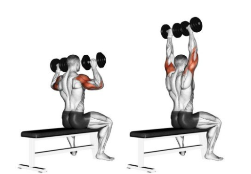 가장 좋은 어깨 운동이라 생각한다. 덤벨의 무게는 가볍게 시작해서 점차적으로 무거운 무게로 변경해가며 어깨 자극을 주도록 한다. 벤치에 앉아 발을 바닥에 고정시키고 코어를 잡아 등과 허리를 세운다. 시작 자세는 덤벨을 허벅지 위에 올려놓고 시작을 하며, 덤벨을 어깨 높이로 올린 후 머리 위로 프레스 동작을 실시한다. 덤벨을 잡은 손의 손바닥이 내 시선과 같은 방향인 앞쪽을 향하도록 한다.