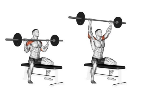 선명한 어깨 라인을 만들기 위해서 필수적인 운동이다. 벤치에 앉아 발을 바닥에 고정시키고 코어를 잡아 등과 허리를 세운다. 그립은 어깨보다 약가나 넓게 잡고, 팔을 완전히 뻗어 머리 위로 바벨을 올리는 자세이다.