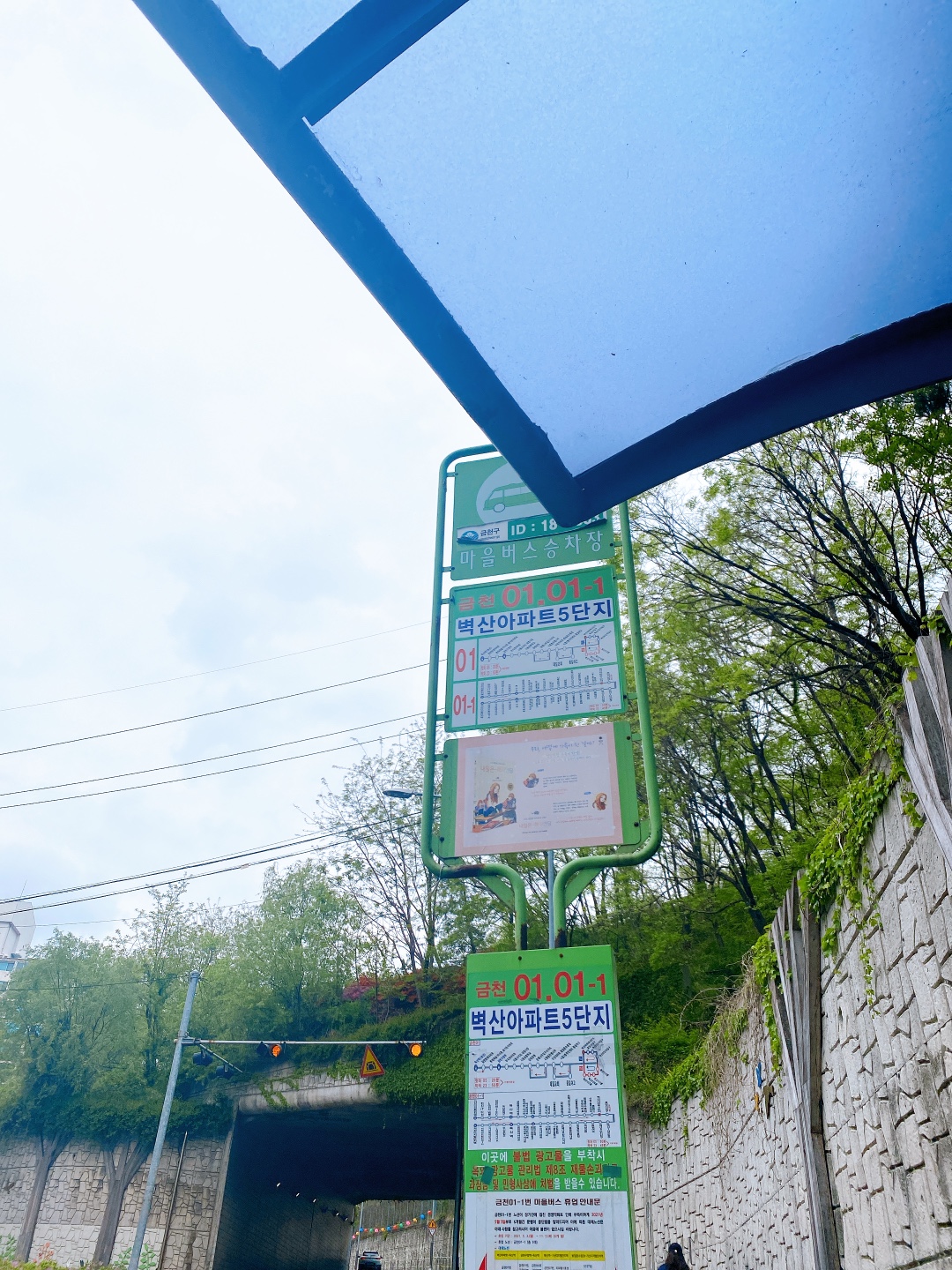 금천구립독산도서관 바로 앞에 08번 마을 바스가 선다. 다만, 버스정류장이 따로 없이 벽을 잘 보기 바란다.. 벽에 정류장 표시가 붙어 있다.