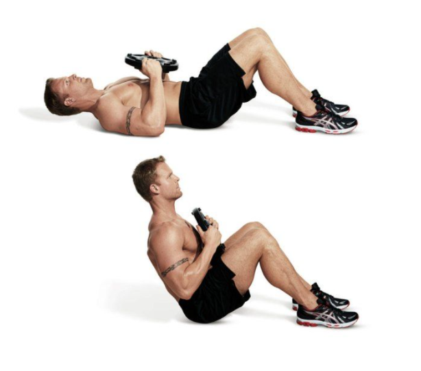 양발을 고정시키고, 중량판을 안고서 싯업을 진행한다. 단 등의 반동을 이용하지말고 복근의 힘으로 앉았다 누웠다 반복한다. 중량 싯업이 힘들다면 맨몸 싯업으로 진행하다가 점차 중량을 늘리도록 한다.
