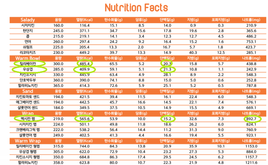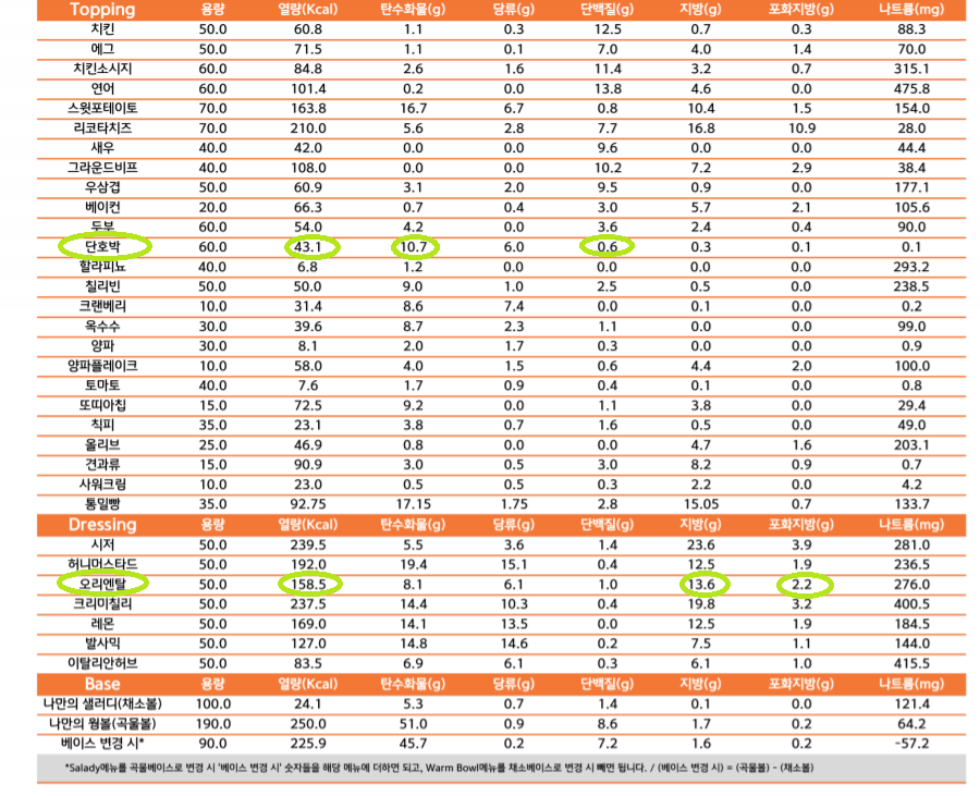 샐러디는 좋은 점이 내가 원하는 토핑을 추가하고, 싫어하는 토핑은 빼기가 가능하다. 드레싱 종류도 7가지나 된다. 맛도 맛이지만 커스터마이징 가능한 샐러드 프랜차이즈라는 점이 핫한 인기 요인이 아닐까 싶다. 아래 표는 샐러디 홈페이지에서 제공하는 칼로리 및 영양성분 표이다. 오늘 먹은 샐러드 칠리 베이컨 웜볼, 우삼겹 웜볼, 멕시칸 랩 등의 칼로리를 확인해 보았다.