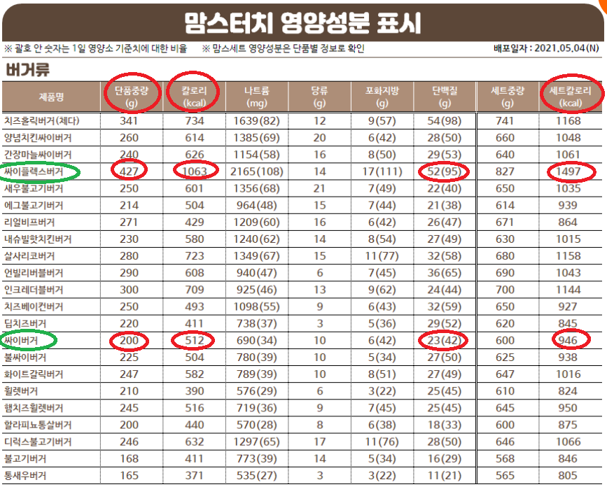 맘스터치 메뉴 칼로리 및 영양성분표이다. 일단 싸이 버거와 싸이 플렉스 버거를 비교해서 보았다.