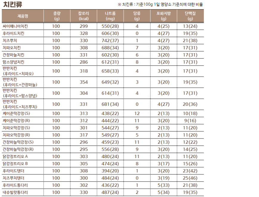 | 맘스터치 메뉴 칼로리 및 영양성분