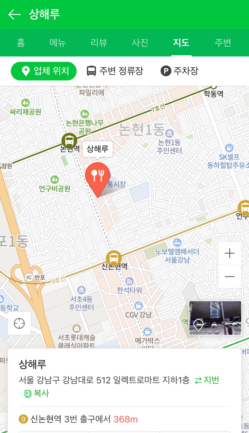 논현역과 신논현역 거의 중간 지점에 위치한다. 일렉트로마트건물 지하 1층에 위지하고 있고, 코로나 시국이라 하더라도 사람들이 엄청 많더라. 건물 좌측에 발렛파킹을 해주기 때문에 주차도 편해서 가끔 저녁에 모임 할 때 자주 방문하는 곳이다. 분위기는 시끌시끌한 분위기다. 일반 면류나 밥류는 7천 원 ~ 1만 원 대로 가격대가 일반 중국집이랑 비슷? 오히려 더 저렴하지만, 중화요리류는 가격대가 조금 있는 편이다. 가격대만큼 맛도 맛있다^^. 논현역 부근 회식장소, 신논현역 부근 회식장소를 찾는다면 상해루를 가보면 좋을 듯하다.