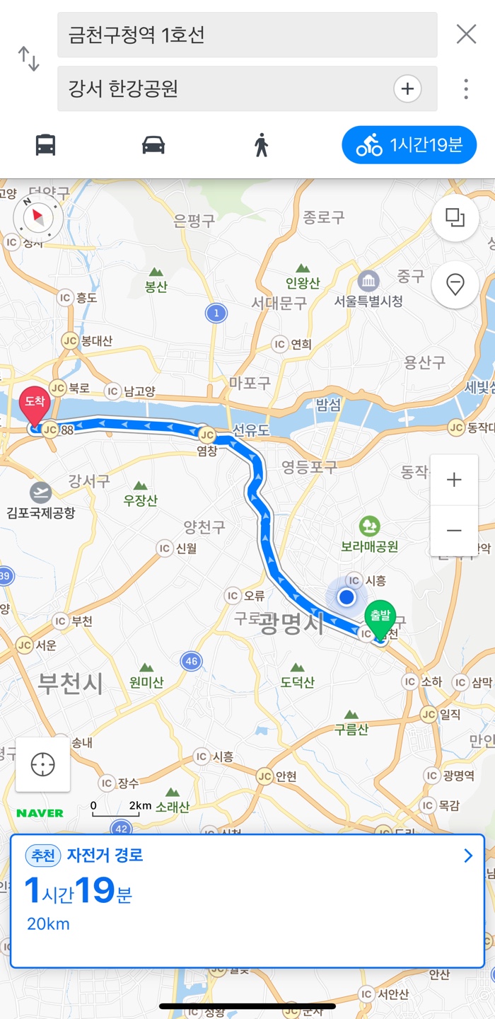 네이버 지도를 보면 20km를 1시간 20분 정도 소요된다고 나오지만, 운동이 될만한 속도로 탄다면 1시간도 걸리지 않는 거리다.