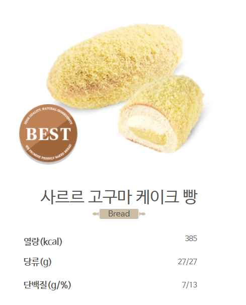 사르르 고구마 케이크 빵. 이름처럼 입안에 넣으면 사르르 녹는다. 도넛류를 많이 좋아하진 않지만, 이 빵은 무조건 보이면 쟁겨 와서 냉장고에 넣어놓고 먹는다. 고구마 필링과 생그림이 듬뿍 들어 있으며, 특히나 겉에 뿌려진 카르테라 가루가 부드럽게 어우러진다. 냉장고에 넣었다가 꺼내먹으면 마치 아이스크림을 먹는 듯한 기분이다. 달콤한 고구마 케이크가 당길 때 간단하게 먹으면 좋다. 우유와 마시면 정말 잘 어울리는 간식이다.