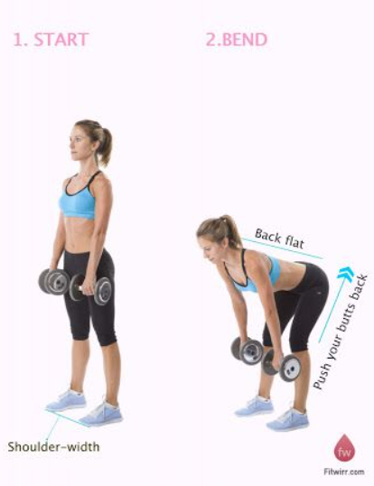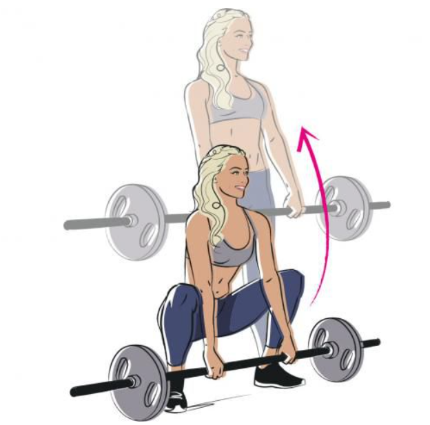 다리를 엉덩이 너비만큼 벌리고, 하중을 발뒤꿈치에 싣고, 코어와 둔근에 힘을 주며 바에 손이 닿을 정도까지 몸을 내려간다. 시작 포즈는 하프 스쿼트 자세와 비슷하다. 몸의 긴장을 유지한 채로 덤벨을 아래에서 위로 당기듯 다리를 핀다.