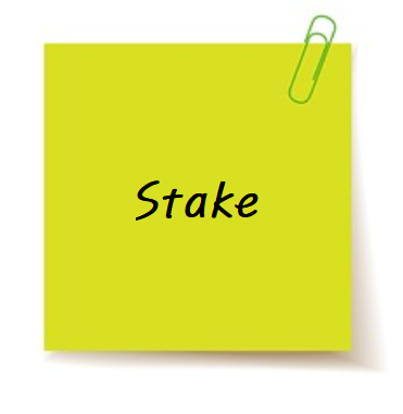 Stake : 말뚝, 지분, (사업 등에 대한)이해관계, (내기 도박에)건 돈, 건 것, (경마에서)상금, 돈을 걸다, 말뚝을 받치다