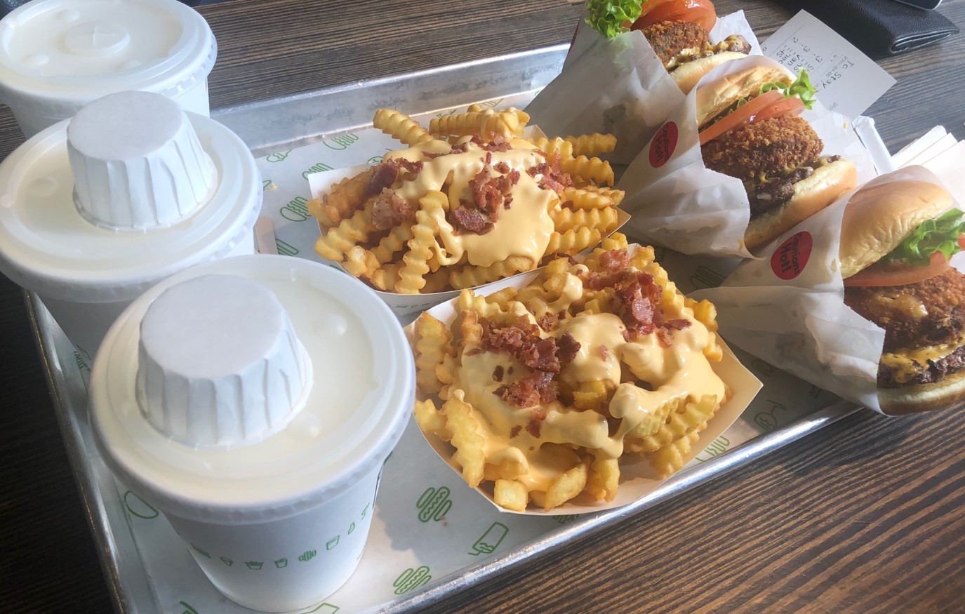 우리가 주문한 메뉴는 쉑 스택(shack stack) 버거, 치즈 프라이(+베이컨칩 추가), 바닐라쉐이크를 주문했다.